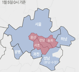 5. 이후 2022년 하반기부터 부동산 경기가 냉각되자 2023년 1월 정부는 용산/서초/강남/송파를 제외한 전 지역의 규제를 해제하였음(아래 그림에서 붉은 지역만 투기과열지구)