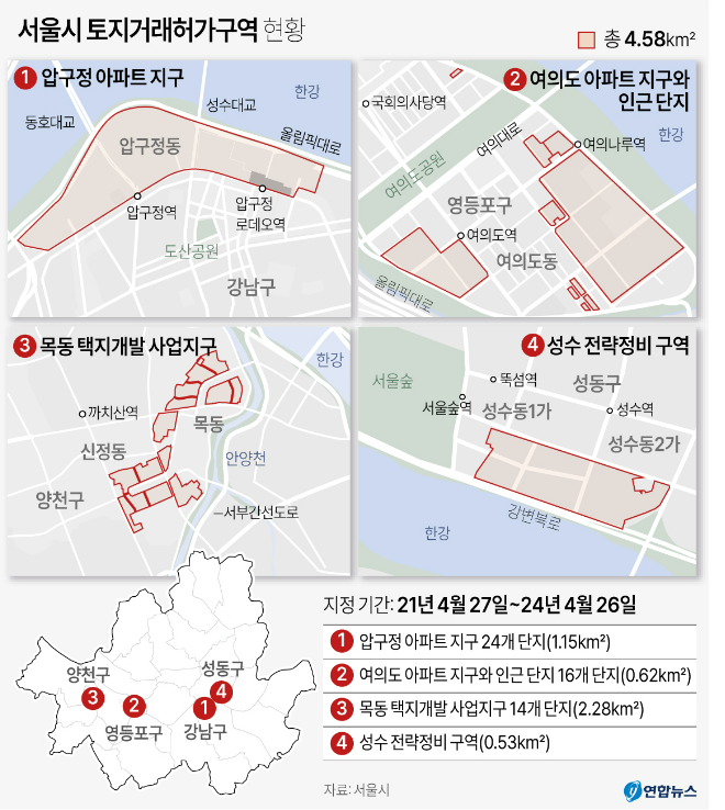 - 아래 그림과 더불어 강남구(압구정동, 삼성동, 청담동, 대치동), 송파구(잠실동), 영등포구(여의도동), 양천구(목동), 성동구(성수동1,2가, 마장동, 사근동)이 전체 해당 지역임