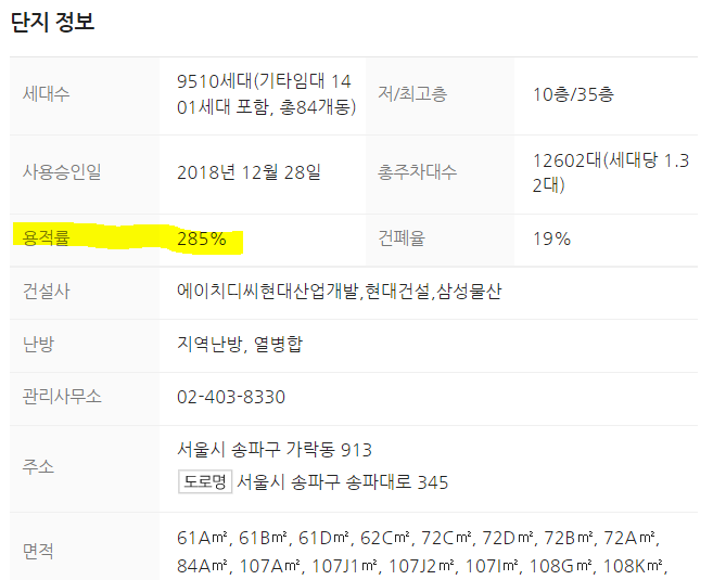 - 헬리오시티의 용적률은 285%로, 건물의 모든 동의 모든 층의 면적을 합친 후 대지 면적으로 나누면 2.85배, 즉 285%가 계산되는 것을 알 수있다.