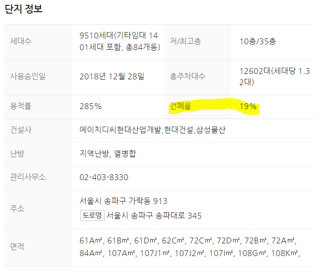 - 건폐율이 19%로 대지면적 대비 건물이 들어선 땅의 공간이 적다는 걸 알 수있다. 최근 아파트들은 높게 짓는 대신, 조경 및 공원 조성 등 쉼을 주는 공간들을 구성하기때문에 건폐율이 낮아지는 추세다.