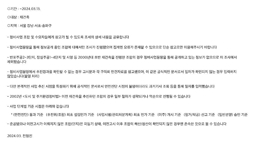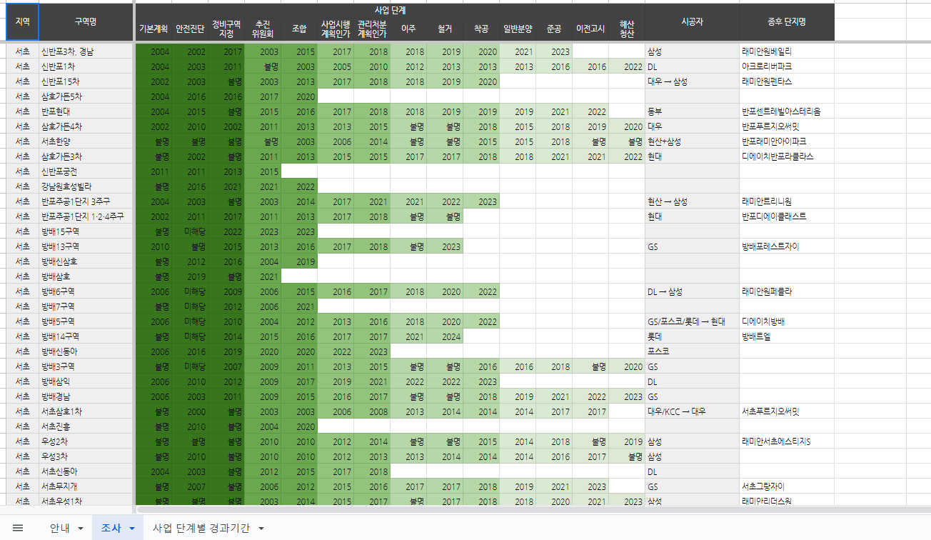 강남3구 재건축 아파트 전수 조사건으로, 이 글에서는 재건축이 어떤 단계로 이루어져 있는지, 각 단계의 의미는 무엇인지, 그리고 각 단계를 통과하는 데 얼마나 시간이 걸리는지 구체적인 데이터를 바탕으로 설명하고자 한다.