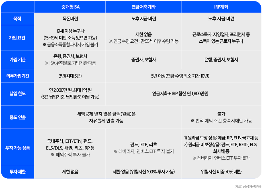 • 특징: 세제 혜택(비과세*), 최소 3년 유지 필요, 투자 자유도 높음