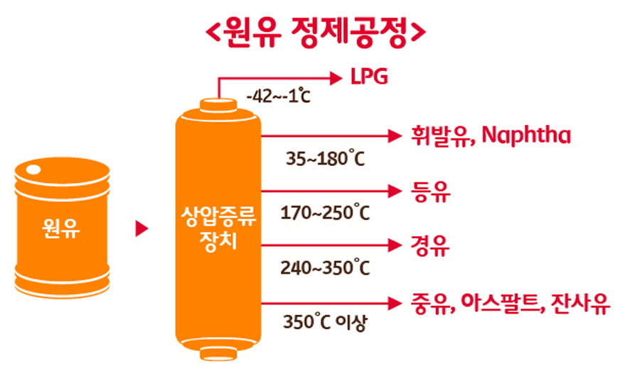 5. ① 상압증류시설(CDU, Crude Distillation Unit)은 원유를 340도 이상으로 가열하여 끓는점 차이를 이용해 각종 반제품(프로판, LPG, 나프타, 등유, 경유) 및 벙커 C유 (상압잔사유*)를 증류분리하는 설비임