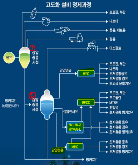 9. ① 상압증류시설(CDU, Crude Distillation Unit) 을 거쳐 분리된 반제품들은 다시 수소 등의 화학물질을 투입하여 내부 이물질( Sulfur 황, Nitrogen 질소 등)을 제거하여 최종 석유제품이 생산됨