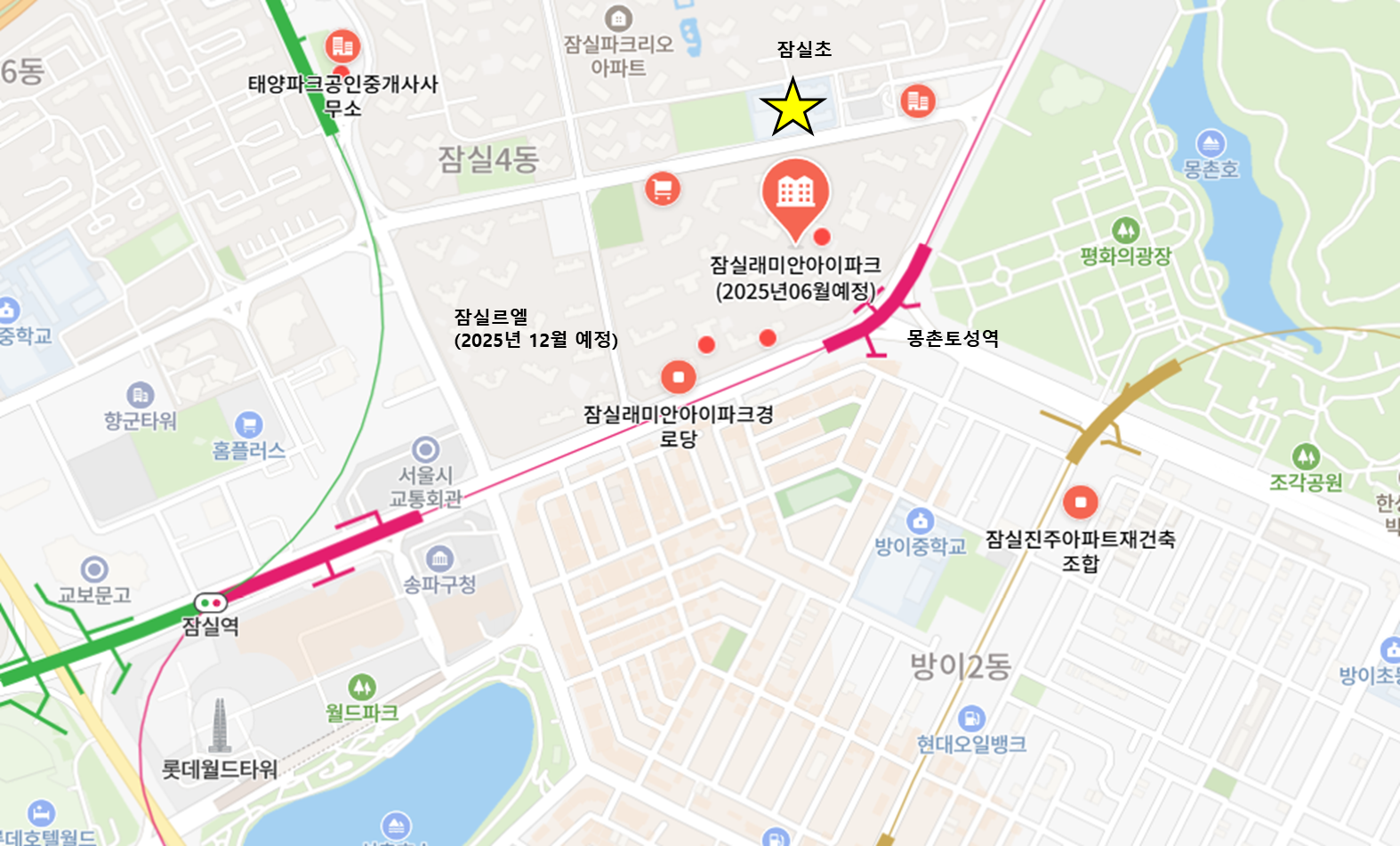 잠실 래미안아이파크는 잠실 진주아파트를 재건축한 단지로 네이버 지도상에는 2025년 6월 준공 예정으로 나와있으나 2025년 12월 입주 예정이다. 잠실초가 바로 앞에 있고, 몽촌토성역과도 인접해 있어 학군 및 교통 모두 우수한 입지이다.