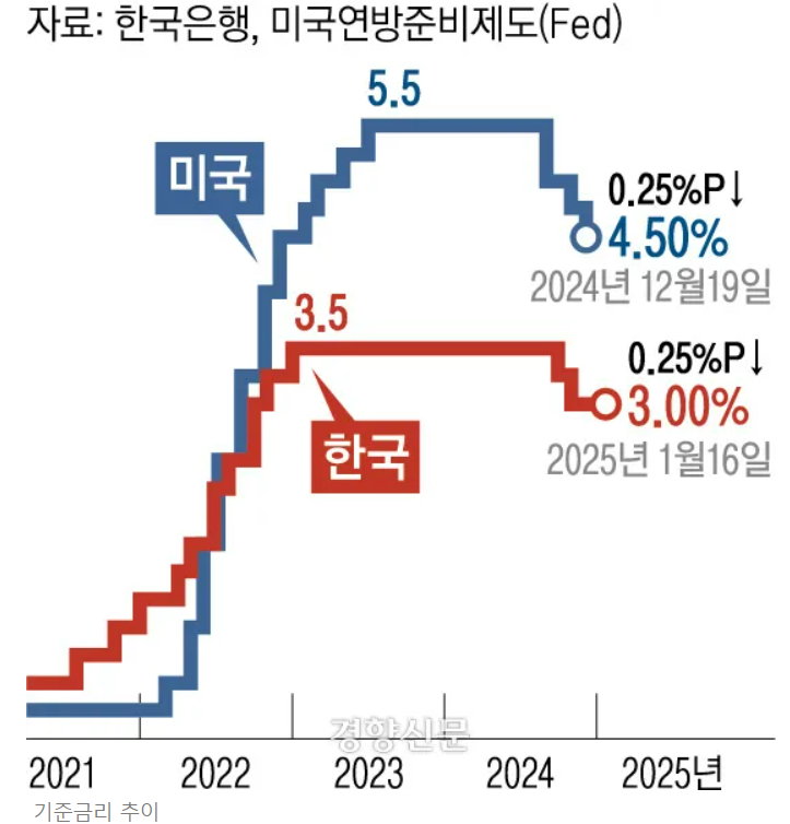 6. 한국은행은 24년 10월, 11월 지속적으로 경기부양을 위해 금리를 낮췄으나 이번 25년 1월은 급등하는 환율 억제를 위해 어쩔수 없이 금리를 동결함