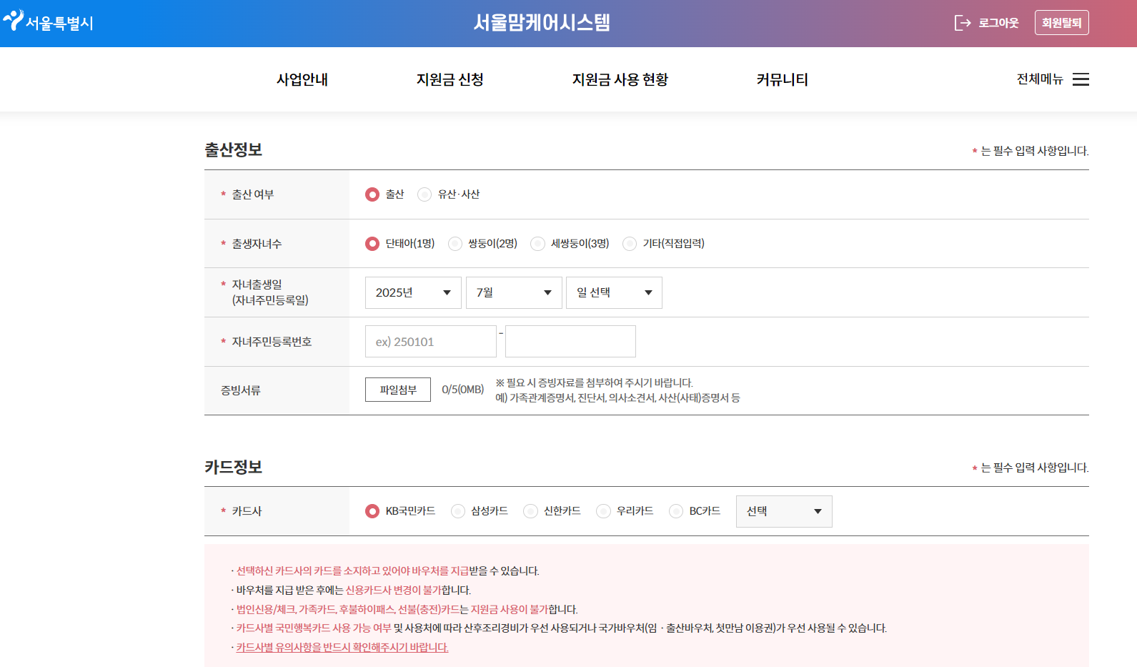 - 신청방법 : 동주민센터 방문(신분증 지참) or서울맘케어시스템