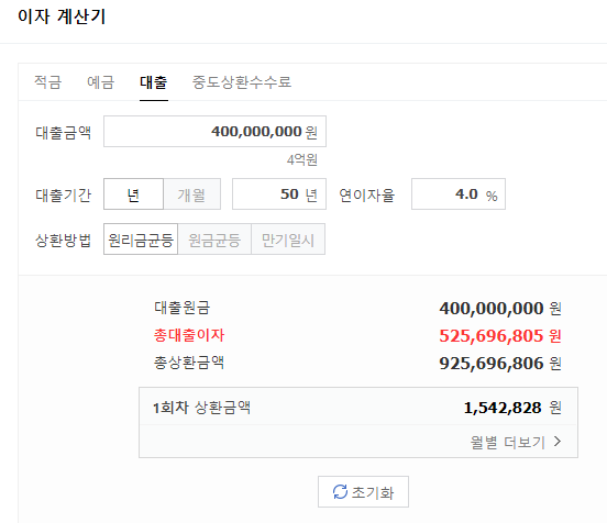 그렇다면 , 4억원을 최대 대출 가능 기간인 50년으로 , 금리 4.0% 로 가정한다면