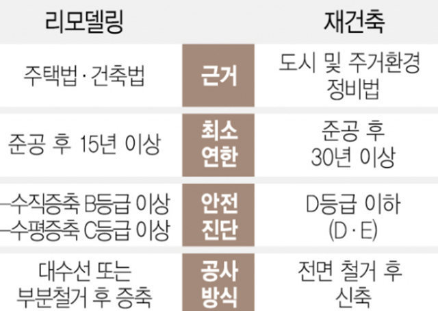 - 재건축은 말 그대로 낡은 아파트를 아예 부수고 처음부터 다시 신축아파트를 짓는 방식이라면 리모델링은 골격은 그대로 두고 수직증축 혹은 수평증축을 통해 추가적으로 세대수를 늘리는 방식이다. 리모델링은 재건축 대비 규제가 적은 만큼 진행을 하더라도 수익률은 낮을 수 있다.