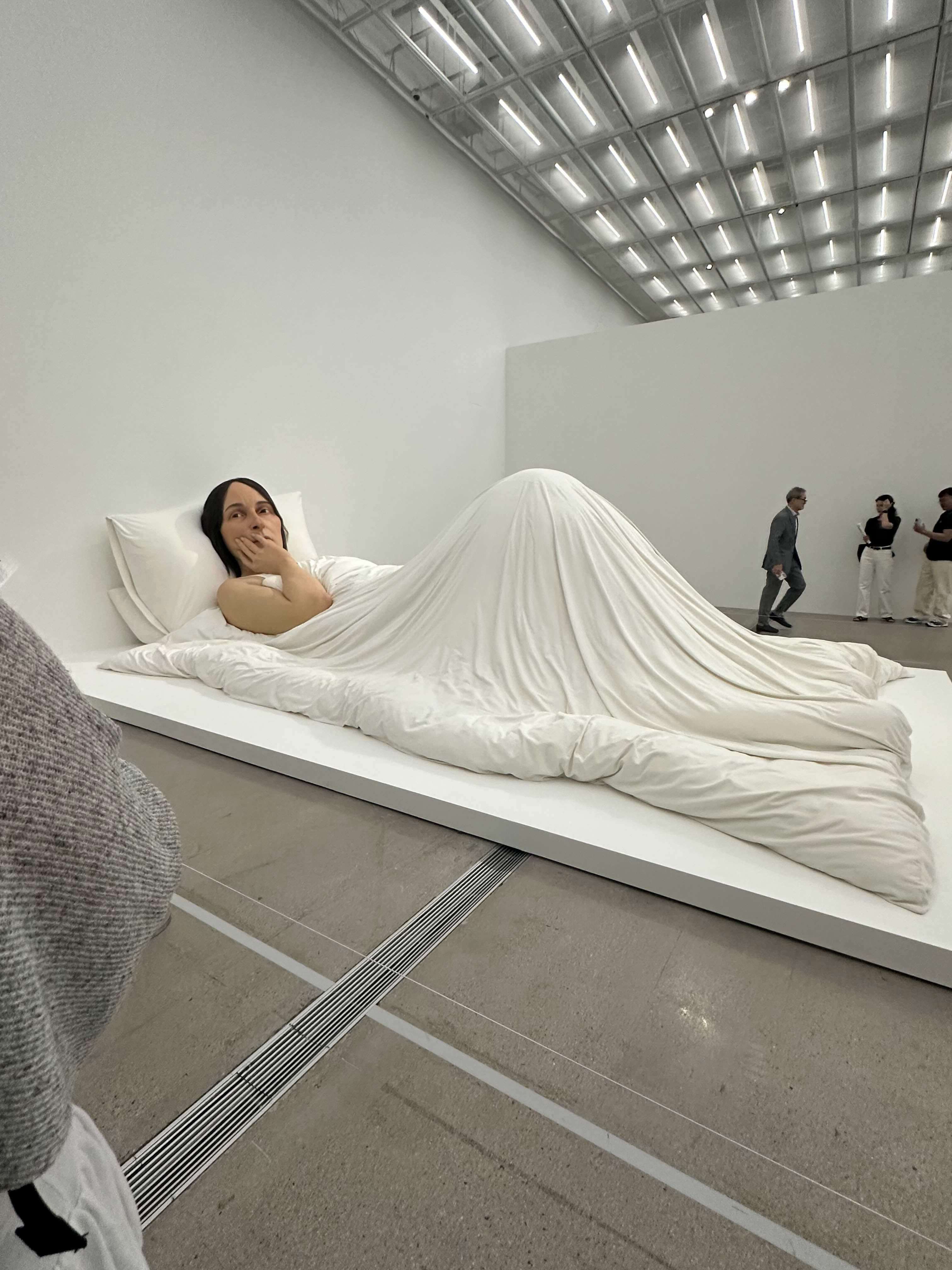 침대에 누워 있는 여성의 모습을 담은 이 작품은 일상적인 순간 속에서 느껴지는 인간의 감정과 사색을 표현한다.