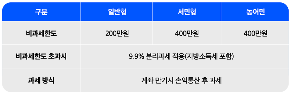 * 투자수익 200~400만원 한도까지 비과세, 비과세 한도 초과시 9.9% 분리과세 적용