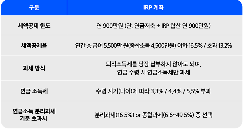 • 세액공제 한도: 최대 900만 원 (연금저축 600만 원 + IRP 300만 원)