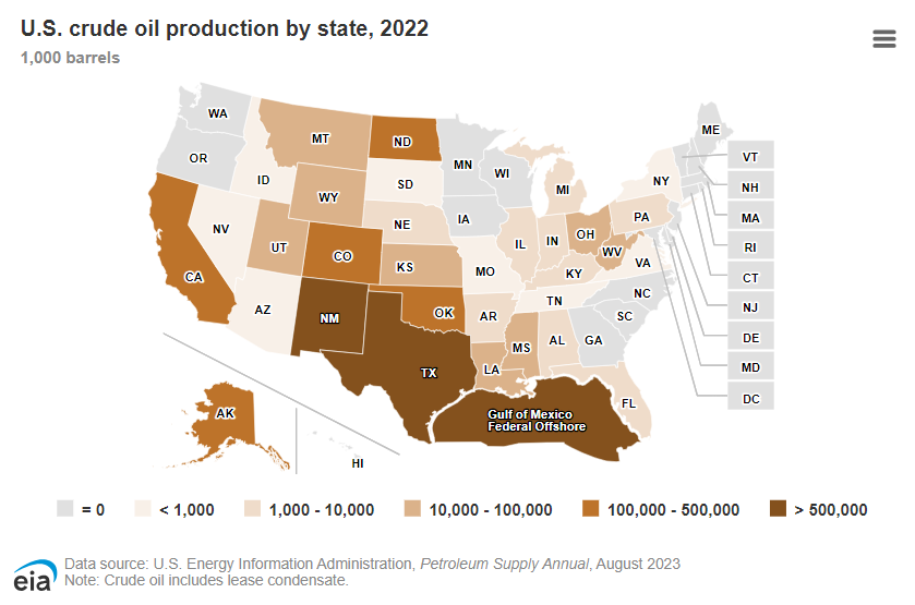 7. 2022년 기준 미국 내 주요 석유 생산 지역은 걸프만,텍사스, 알래스카 등임
